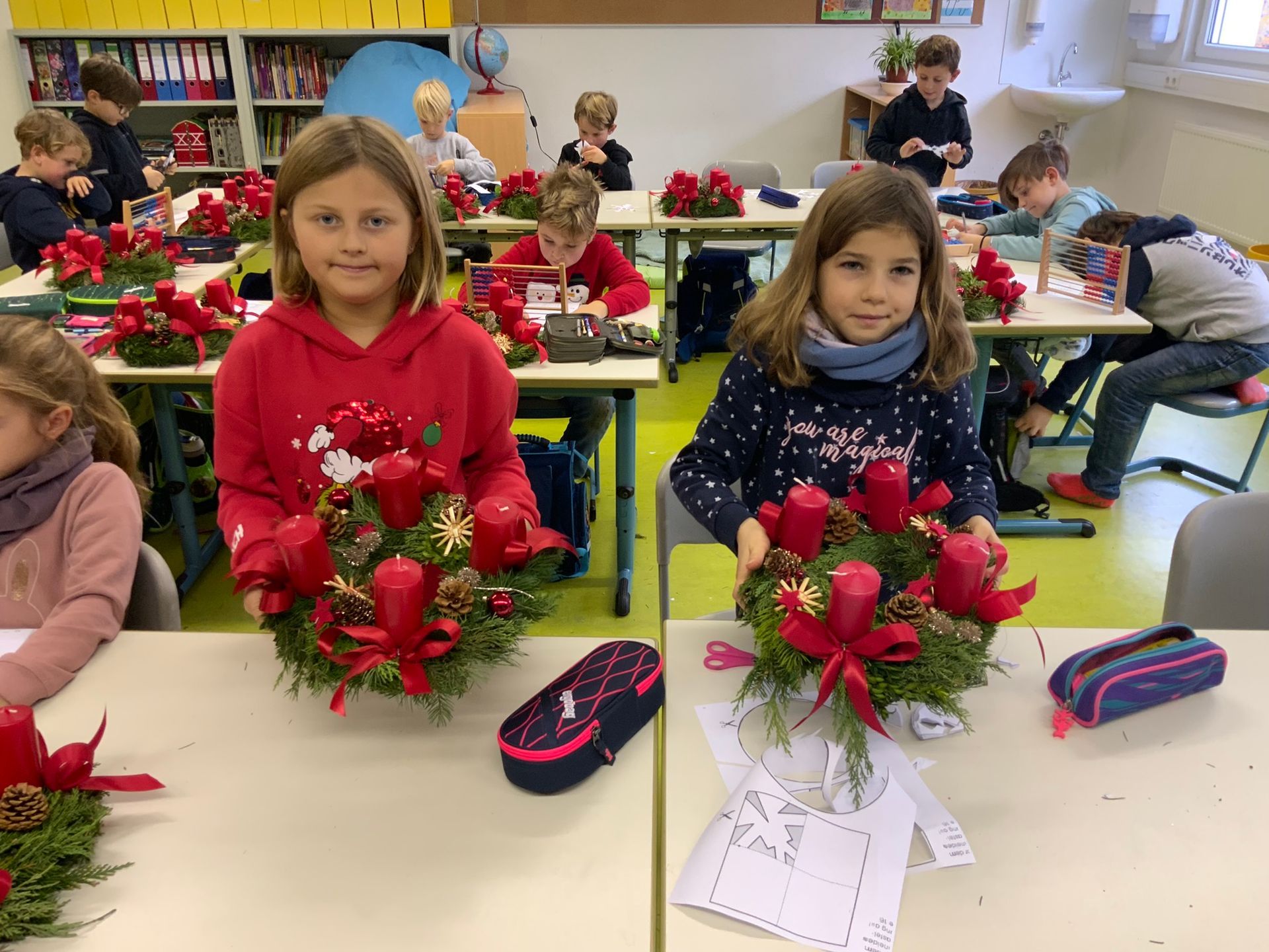 Die Klasse 2 bastelt mit Frau Wunder Adventskränze.
