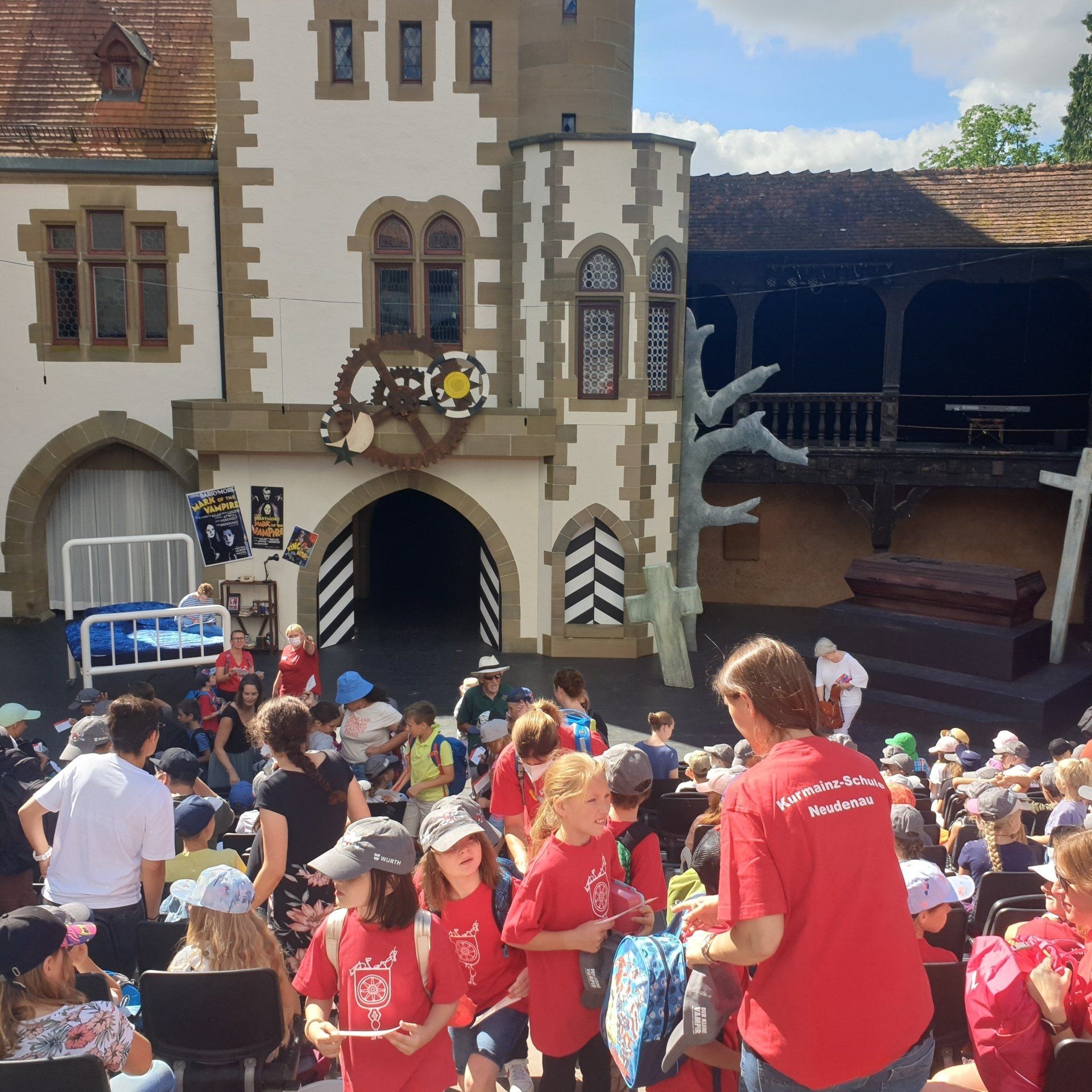 Am 12.Juli besuchte die ganze Schule das Theaterstück "Der kleine Vampir" in der Götzenburg Jagsthausen. Bei heißen Temperaturen und schönem Ambiente bekamen wir eine tolle Show geboten. Danke an den Förderverein, der uns wieder finanziell unterstützt hat.