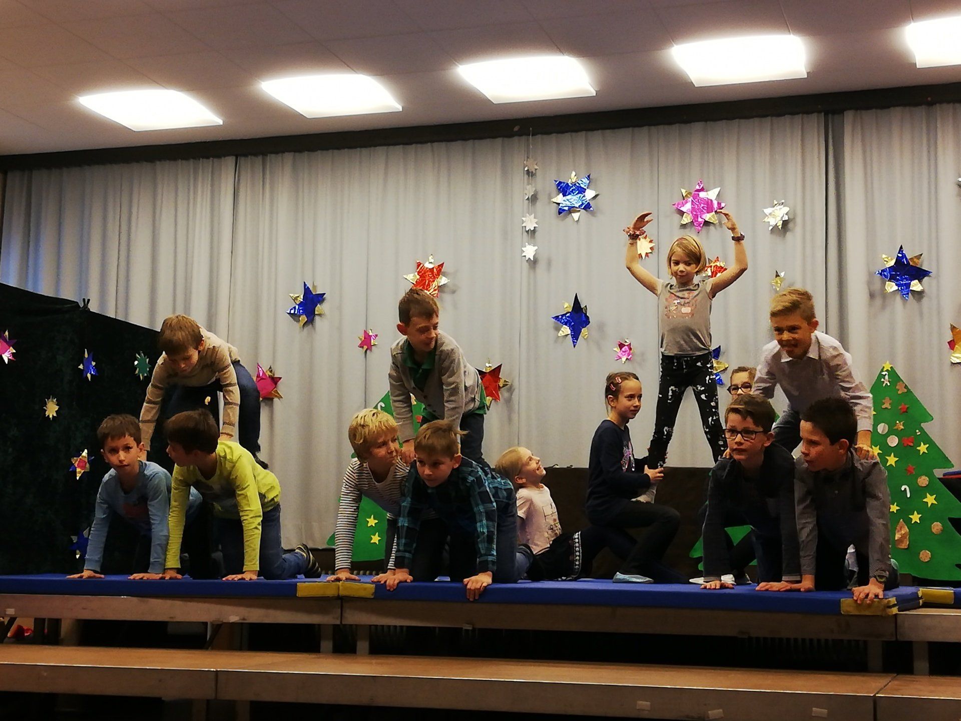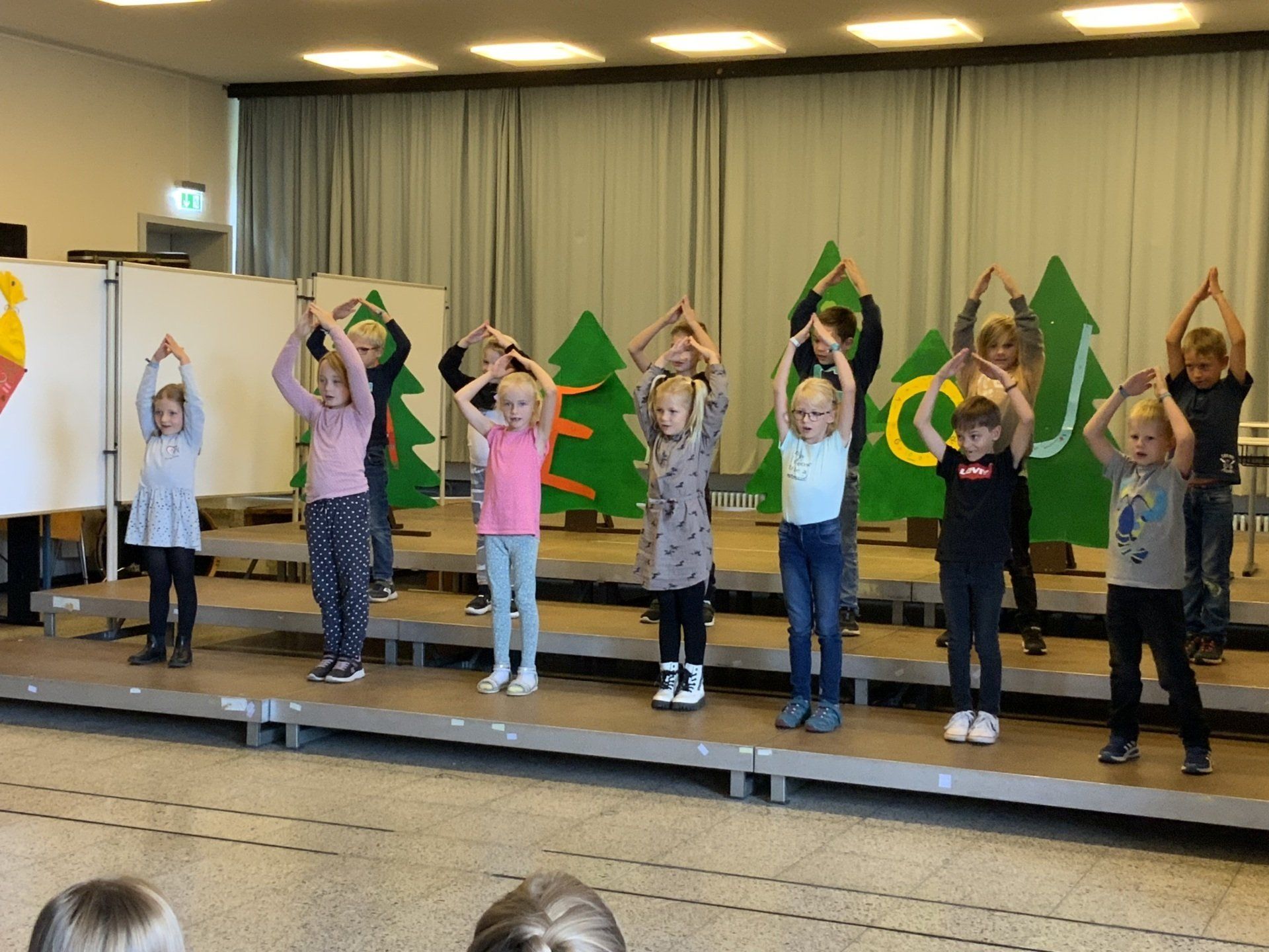 In der vorletzten Schulwoche kam eine Tanzlehrerin namens Melissa zu uns und zeigte uns verschiedene Tänze. Klasse 4 tanzte zu dem Lied Hit it von den Black Eyed Peas. Wir trainierten jeden Tag zwei Schulstunden. Am 14.07.23 um 16 Uhr war es dann soweit. In der Turnhalle sang zuerst der Chor und danach zeigten die Klassen ihre Tänze. Zum Abschluss tanzte die ganze Schule zu Helene Fischer. Am Ende wurde die Klasse 4 noch aus der Schule verabschiedet und sang ein Lied. Eltern hatten draußen noch etwas zu essen und zu trinken vorbereitet.